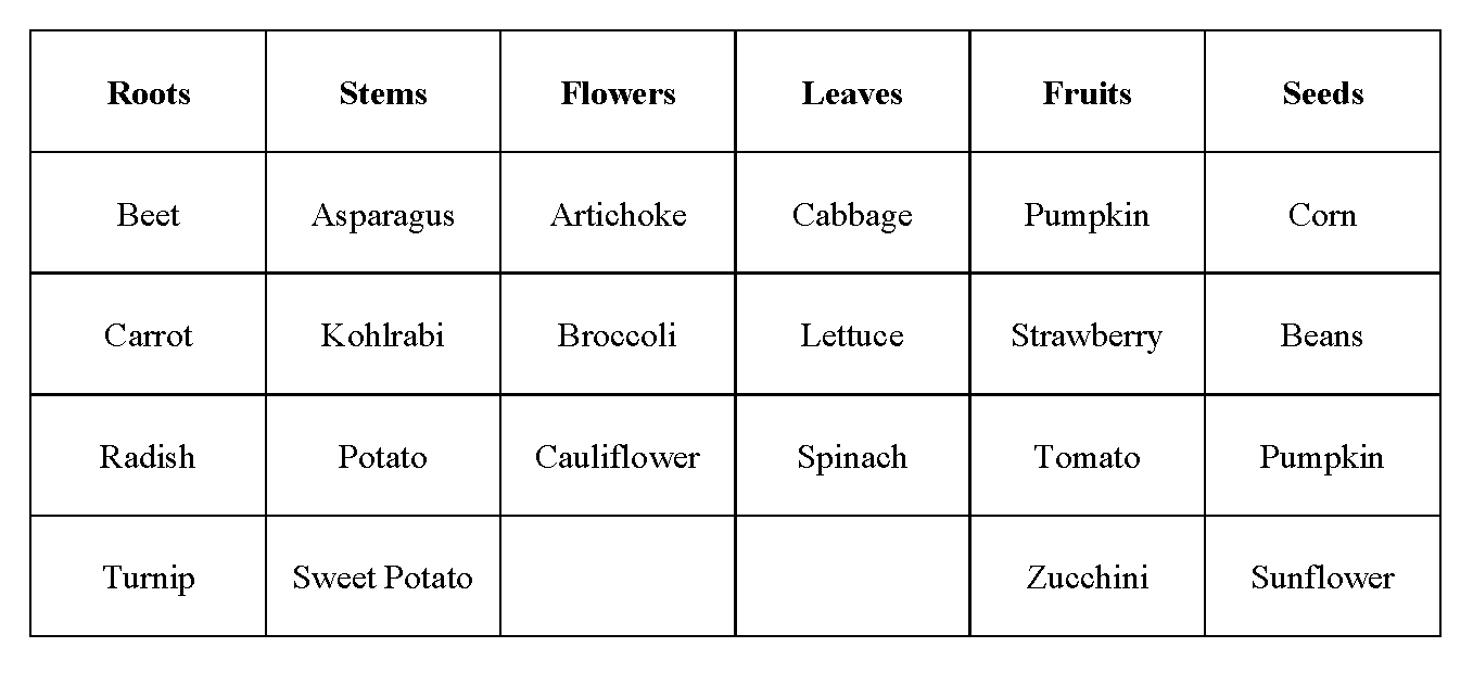 - Instead of buying fruits and vegetables for display, draw columns on the board for roots, stems, flowers, leaves, fruits, and seeds and ask students to help you fill in examples of each.